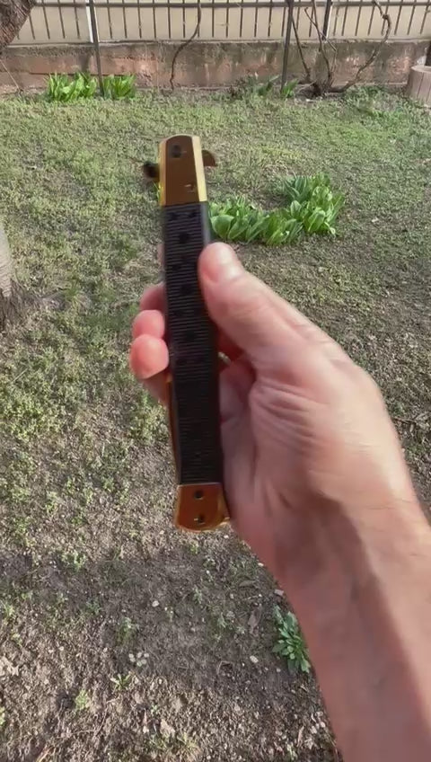 Acest model este un cuțit Stiletto cu un design deosebit și elegant într-o culoare aurie atrăgătoare. Dispune de un mecanism automat de deschidere manuala, un sistem de blocare a lamei și o siguranță împotriva deschiderii accidentale. Este ideal pentru a fi purtat în buzunar.