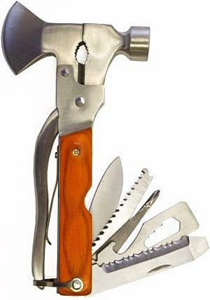 Cu ciocanul nostru multifuncțional, sunteți pregătit pentru orice provocare. Acesta este echipat cu 19 instrumente diferite, inclusiv cuțit zimțat, cuțit, pilă, șurubelniță cu cap plat, șurubelniță mică Phillips, securet, patent, clește de prindere, ciocan de urgență, bolț cu cap pătrat, spartor de nuci, tăietor de sârmă, fierăstrău, îndepărtător de cârlige, cheie pentru șuruburi, deschizător de sticle, demontor de cabluri și mâner de lemn colorat. Indiferent de situație, acest instrument multifuncțional vă va ajuta să faceți față cu ușurință.