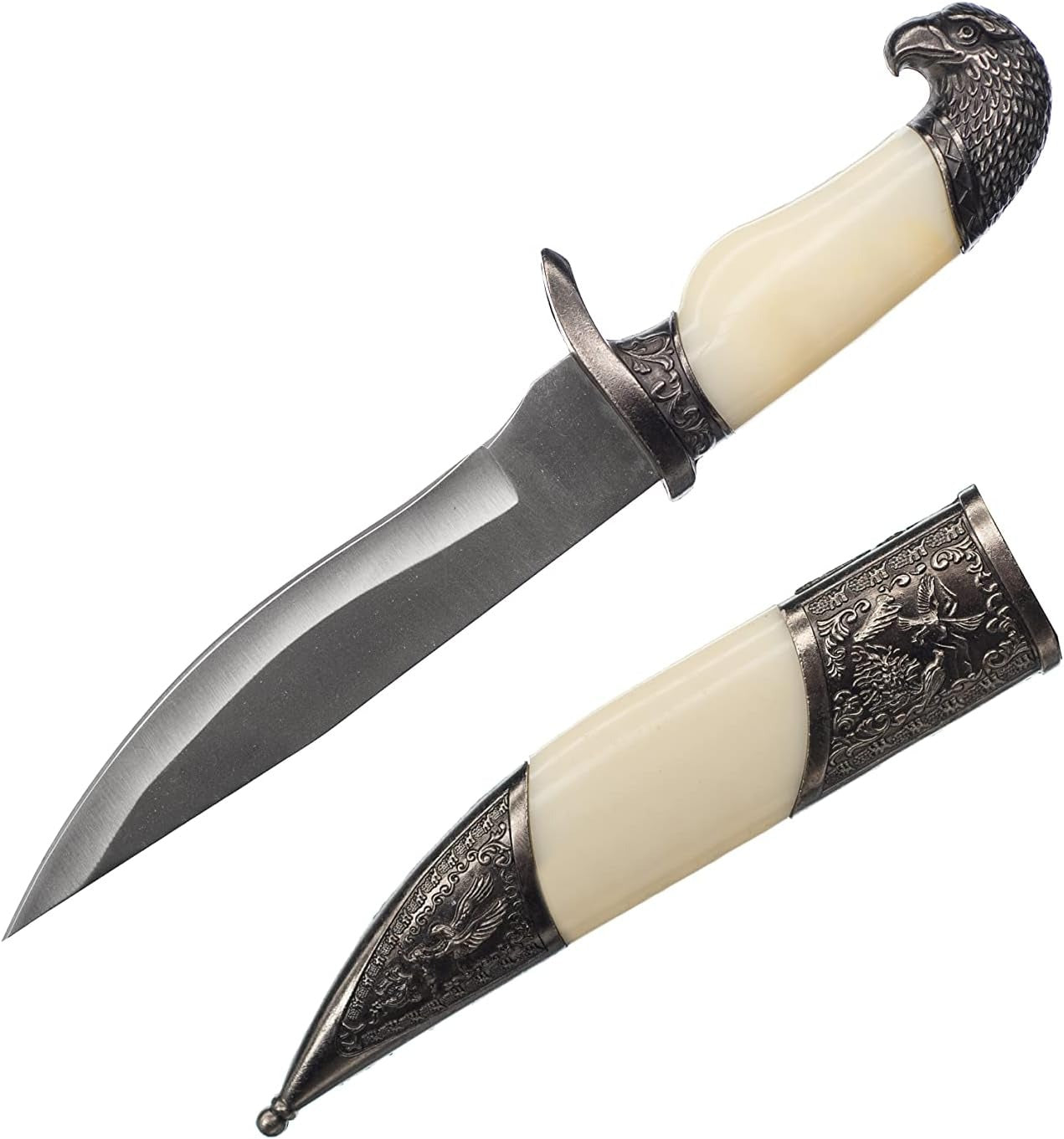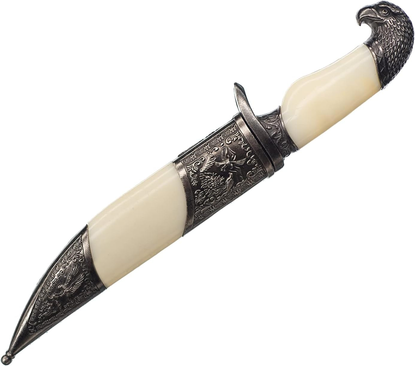 Cu o lamă din oțel și un mâner din plastic și metal, acest pumnal îmbină frumusețea cu durabilitatea. Fiecare detaliu este finisat cu grijă pentru a oferi o experiență autentică și plăcută.